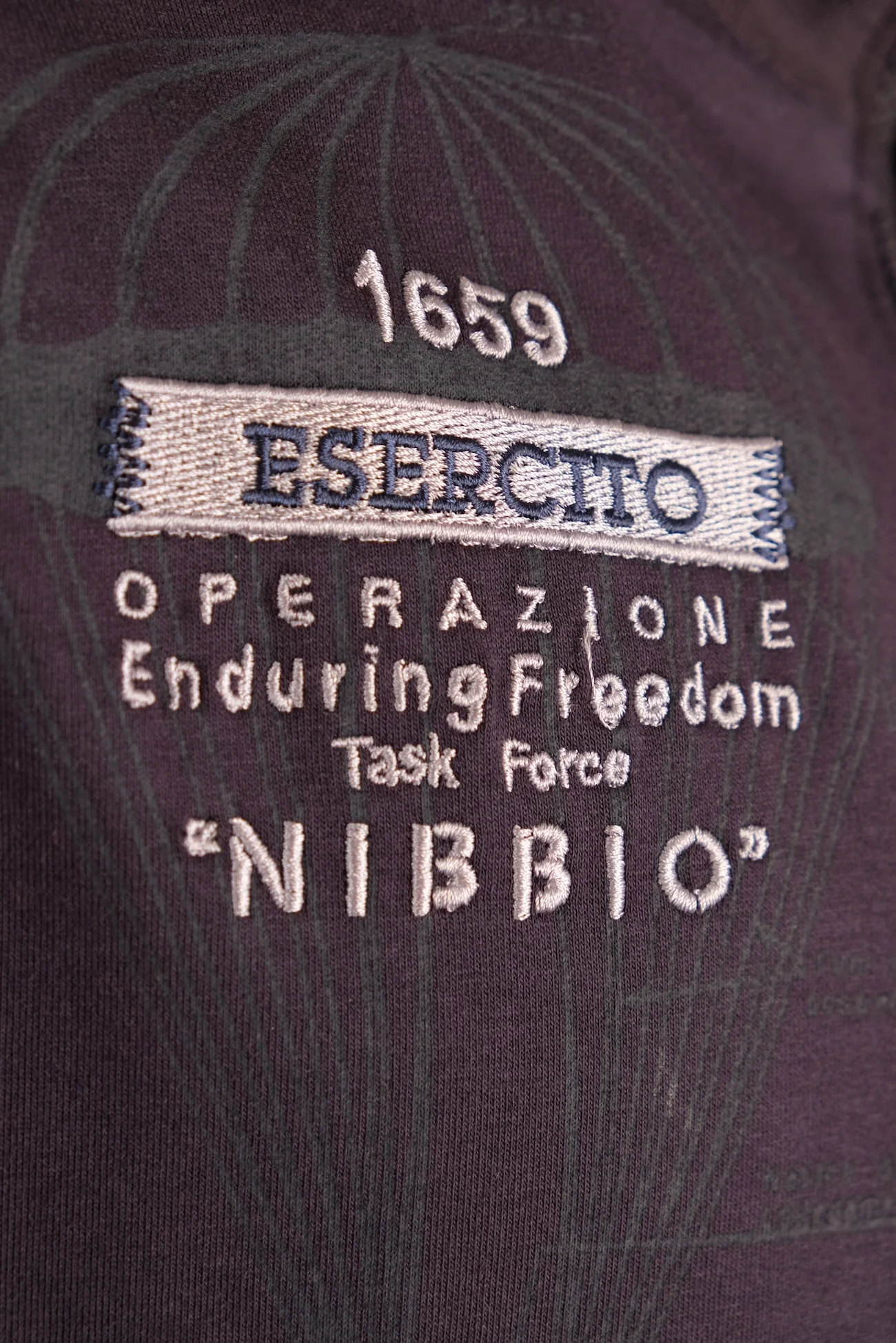 Felpa uomo con zip integrale senza cappuccio. Il design distintivo presenta una stampa frontale con paracadute e ricami grafici inerenti all' Operazione Enduring Freedom Tasck Force 'Nibbio', oltre al ricamo del logo Brigata Paracadutisti Folgore a punto cuore. Realizzata in cotone elasticizzato, questa felpa garantisce comfort quotidiano e vestibilita' regolare. Il colletto alto e i polsini elasticizzati assicurano protezione e praticita', rendendola perfetta per la mezza stagione o per completare un outfit casual sportivo. Comode tasche laterali e logo Esercito ricamato sulla manica sinistra su patch in canvas con stelletta in metallo brunito.