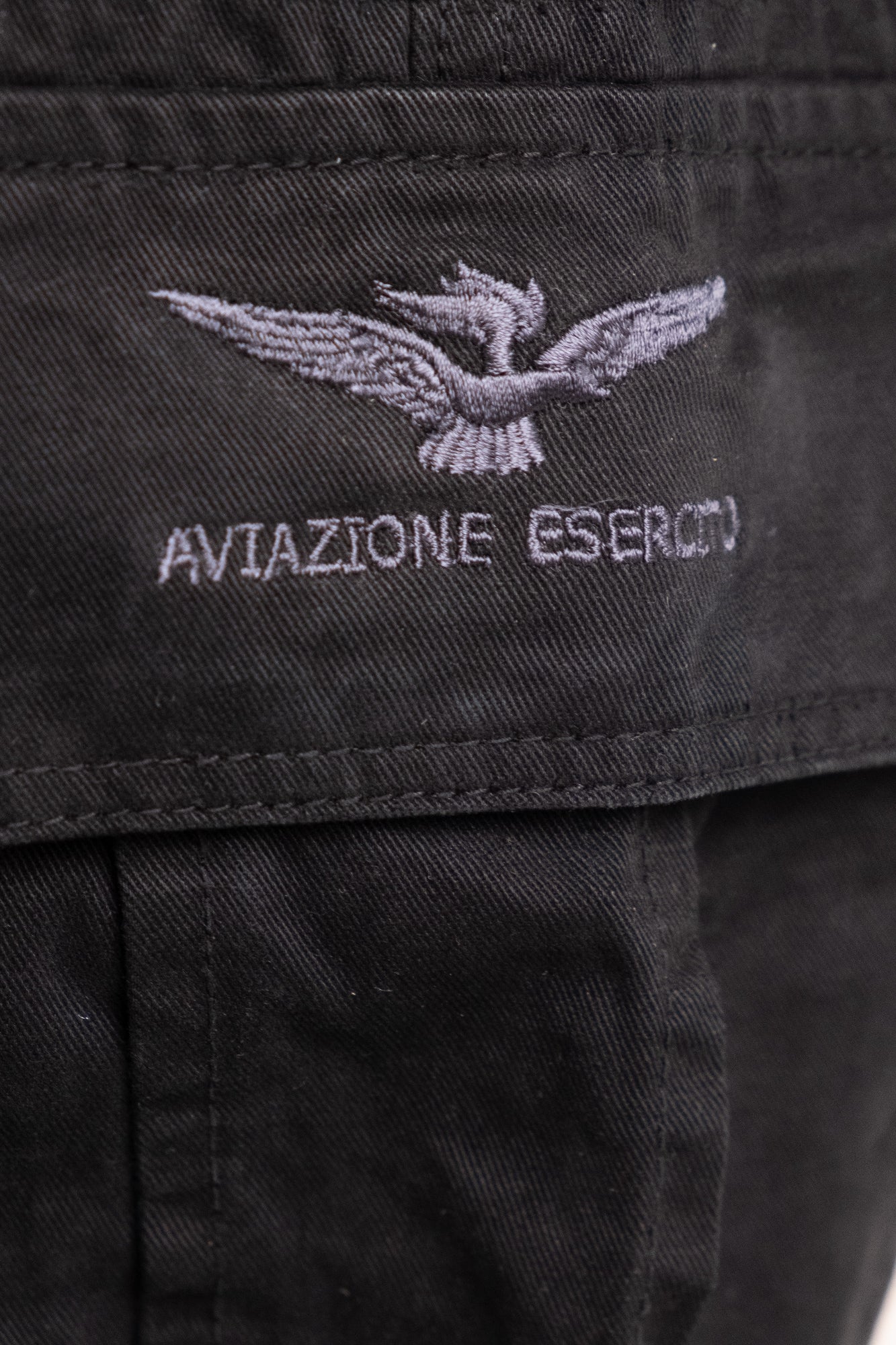 Pantalone cargo con fondo dritto e tasche sui fianchi. Ricami e patch Aviazione Esercito.