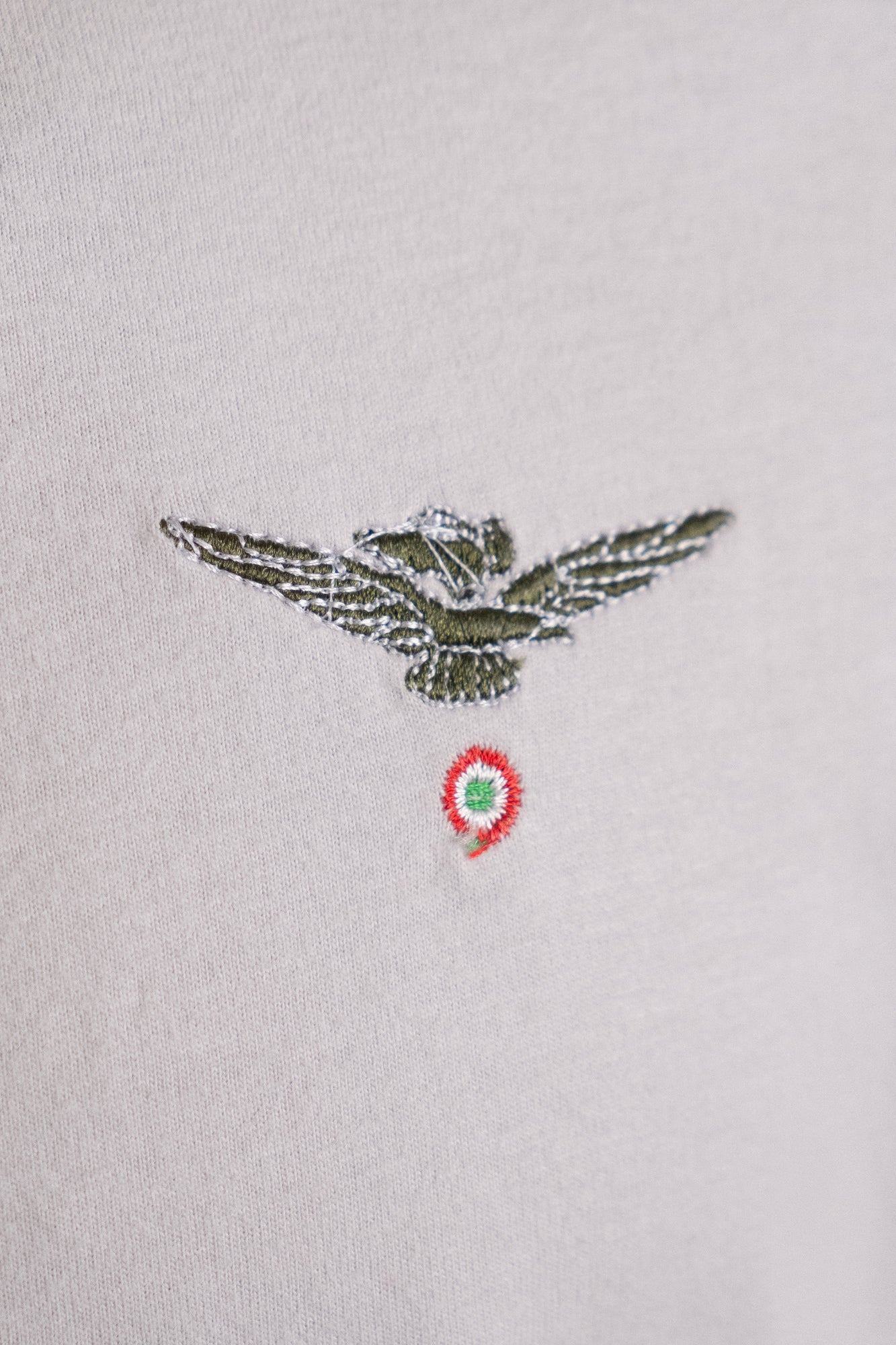 Polo a manica lunga in jersey di cotone, colletto e polsini in costina, spacchetti laterali. Ricami Aviazione Esercito, patch in canvas con stelletta in metallo brunito sulla manica sinistra.