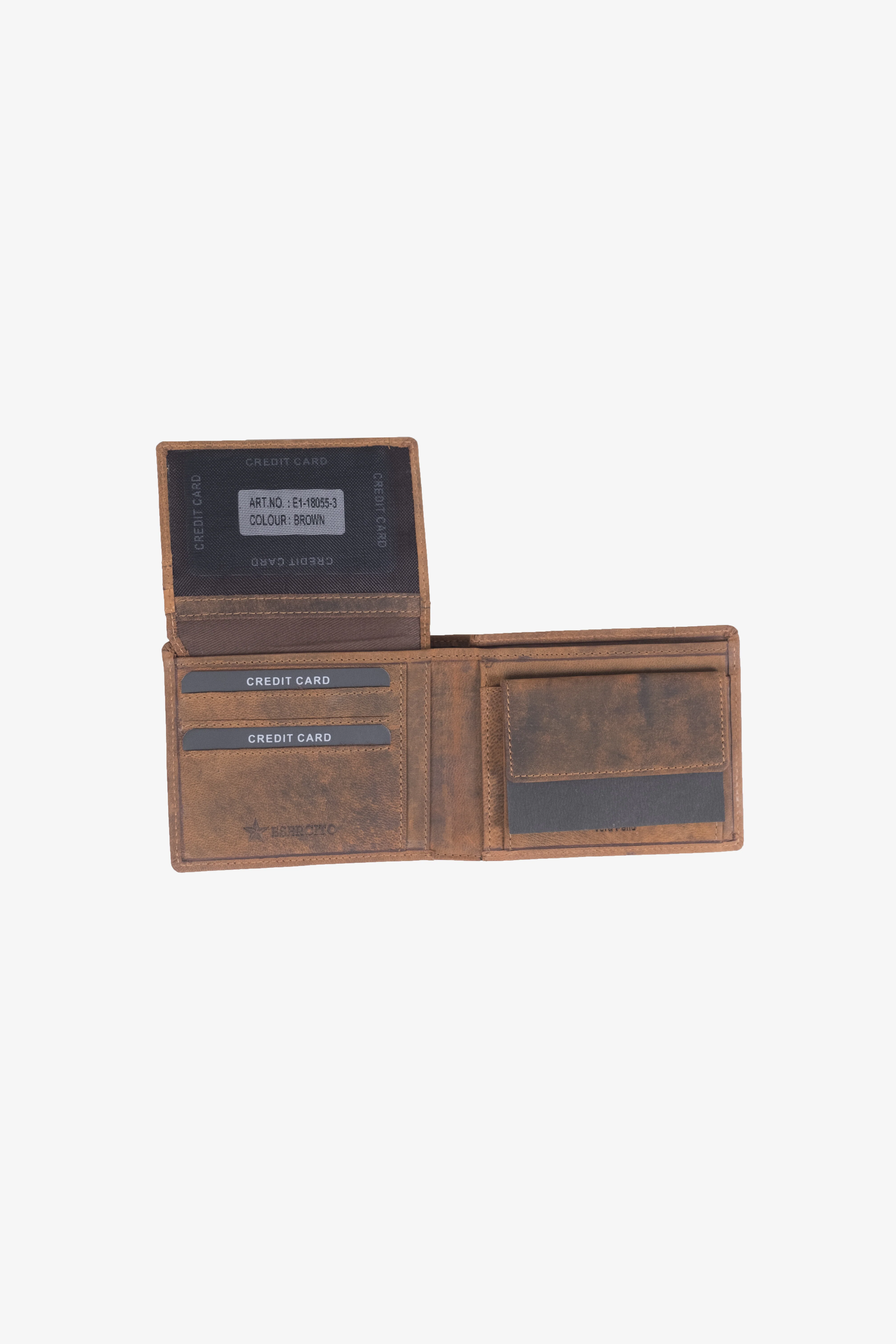 Portafoglio uomo realizzato in vera pelle liscia con logo Esercito con stelletta impresso sul davanti, e' dotato di tasche interne per le banconote e i documenti, numerose slot per carte di credito e sezione porta monete abbottonata.