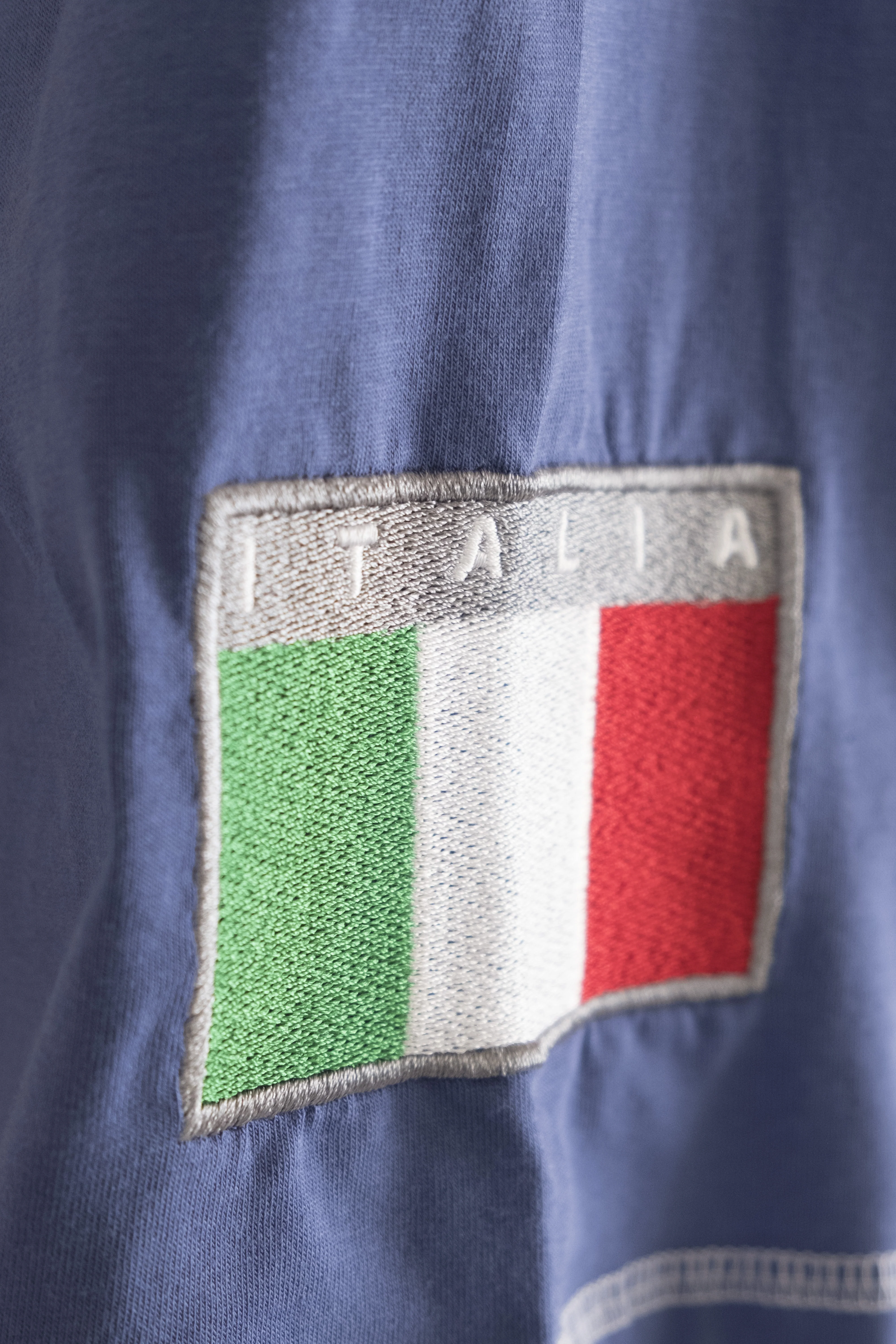 T-shirt in stile football americano e scollo V, vestibilita' oversize, stampa Esercito Italiano, spalle e impunture a contrasto colore. Ricamo tricolore sulla manica destra.